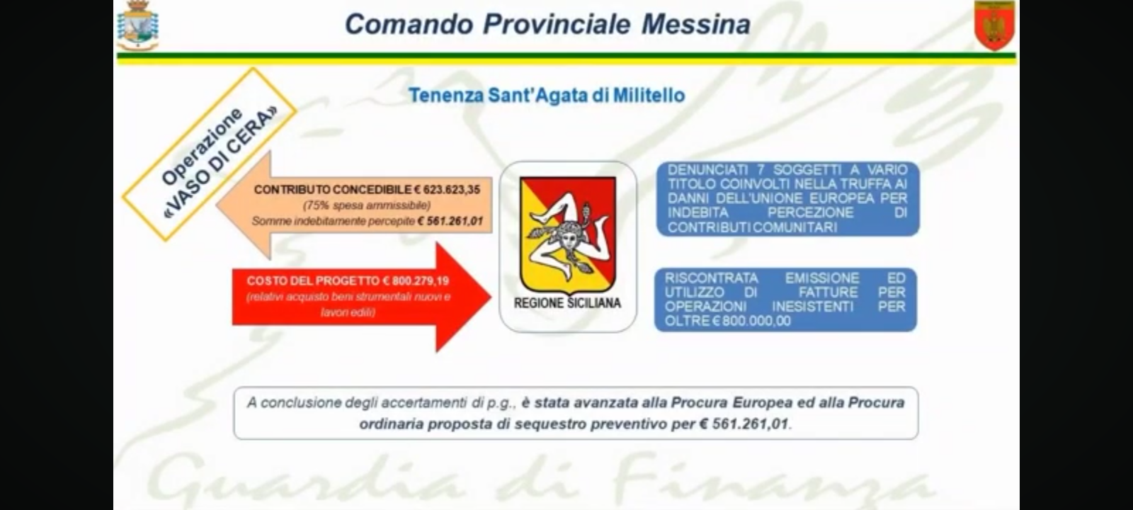 Le Fiamme Gialle della Tenenza di Sant’Agata di Militello, coordinate dalla Procura Europea (European Public Prosecutor’s Office) di Palermo hanno denunciato cinque imprenditori per il reato di truffa ai danni della Regione Siciliana: di qui il provvedimento di sequestro preventivo di beni – ai fini della confisca – per un valore di oltre 800 mila euro, parte relativa al profitto del reato e parte relativa ai profitti derivanti dalle imposte evase a seguito dell’utilizzo di fatture per operazioni inesistenti.