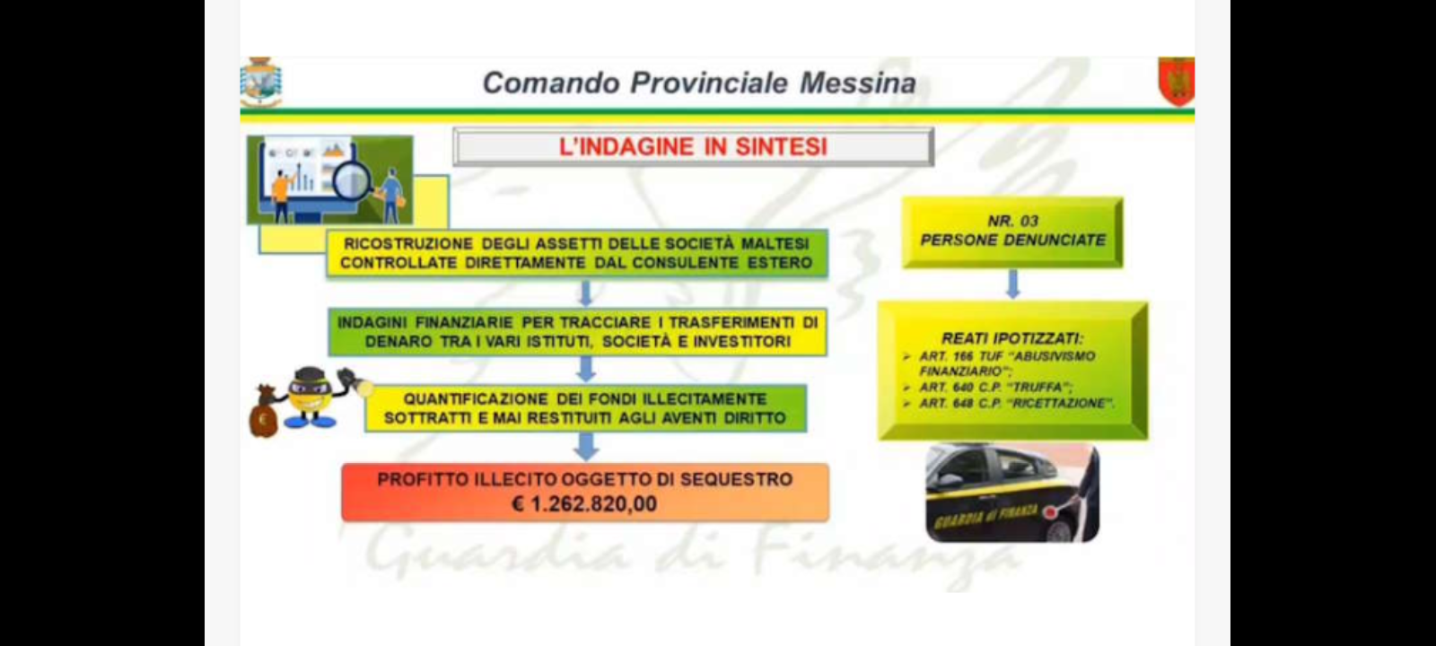 L’inchiesta è scaturita dalla denuncia di due investitori che avevano segnalato il mancato rimborso delle somme affidate ai consulenti. Secondo quanto ricostruito dagli investigatori, i due indagati – uno operante nel Messinese e l’altro in territorio svizzero – avrebbero sfruttato la propria esperienza nel settore della consulenza finanziaria per proporre investimenti in obbligazioni di società maltesi, prospettando rendimenti elevati e sicuri.