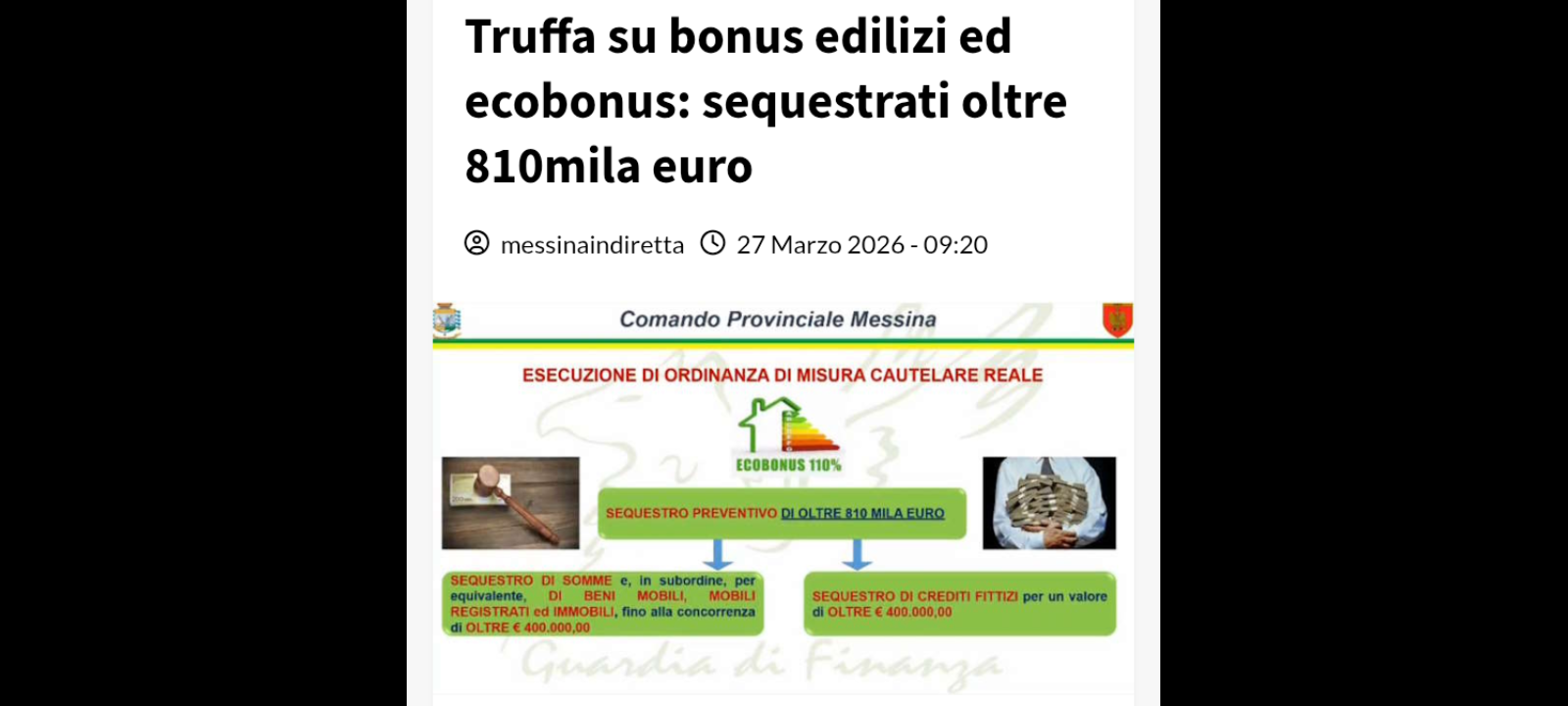 I militari del Comando Provinciale della Guardia di Finanza, su disposizione dei magistrati della Procura della Repubblica di Messina, nelle ore scorse hanno condotto una maxi operazione giudiziaria nel settore dei bonus edilizi… eseguendo un sequestro preventivo per un valore superiore a 810mila euro nei confronti di due persone e di una società cooperativa a loro riconducibile.