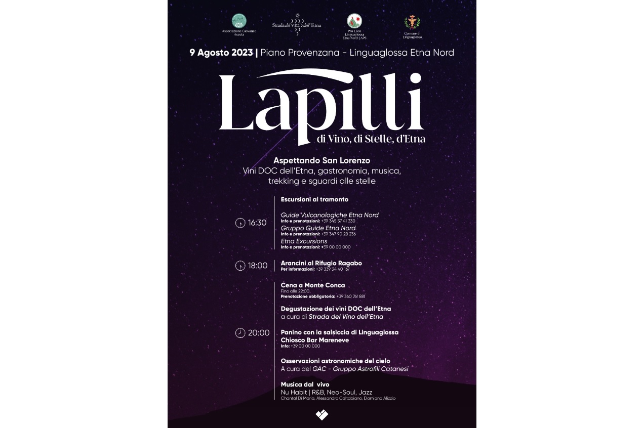 Il Comune di Linguaglossa insieme all’associazione Strada del Vino e dei Sapori dell’Etna, all’associazione Ascuta e alla ProLoco di Linguaglossa, insieme per Lapilli, un evento per promuovere e vivere lo scenario unico della “muntagna” a oltre 1810 metri di altezza sul livello del mare, a Piano Provenzana: una sinergia per dar vita ad un evento che unisce vino, food, trekking e sguardi alle stelle. Una scommessa che continua per il secondo anno quella del Comune di Linguaglossa che per la nuova edizione di mercoledì 9 agosto 2023 ha coinvolto la Strada del Vino e dei Sapori dell’Etna per l’organizzazione dei banchi di assaggio dei vini Etna Doc. Al tramonto, dalle ore 18:30, sarà possibile degustare tra oltre 50 etichette di vini Etna DOC dei diversi versanti del vulcano… bianchi, rossi, rosati e spumanti. Ad occuparsi del servizio mescita saranno i sommelier dell’AIS Associazione Italiana Sommelier che tra le complesse note minerali e l’inconfondibile carattere vulcanico dei vini dell’Etna, sapranno consigliare la scelta del vino al calice.