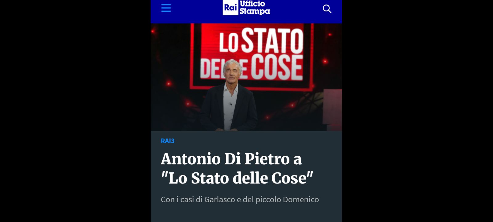 ‘Il “faccia faccia” con Antonio Di Pietro sugli argomenti centrali della stagione politica e il referendum costituzionale sulla riforma della giustizia; e ancora, sul delitto di Garlasco, parla Andrea Sempio a un anno dall’inizio della nuova indagine a suo carico: come è cambiata la sua vita? Cosa pensa degli indizi contro di lui? E poi, il grande mistero di questa storia: cosa ha visto Chiara Poggi sul pc di Alberto Stasi la sera prima di essere uccisa? I consulenti della famiglia Poggi e quelli della difesa Stasi sono su posizioni contrapposte. Parleranno i due periti Roberto Porta e Daniele Occhetti che, nel processo di primo grado, analizzarono il pc di Stasi trovando il suo alibi’. Sono questi, alcuni dei temi de “Lo Stato delle Cose”, il programma di attualità e approfondimento di Massimo Giletti, che è iniziato in onda lunedì 16 marzo alle 21.20 su Rai3.