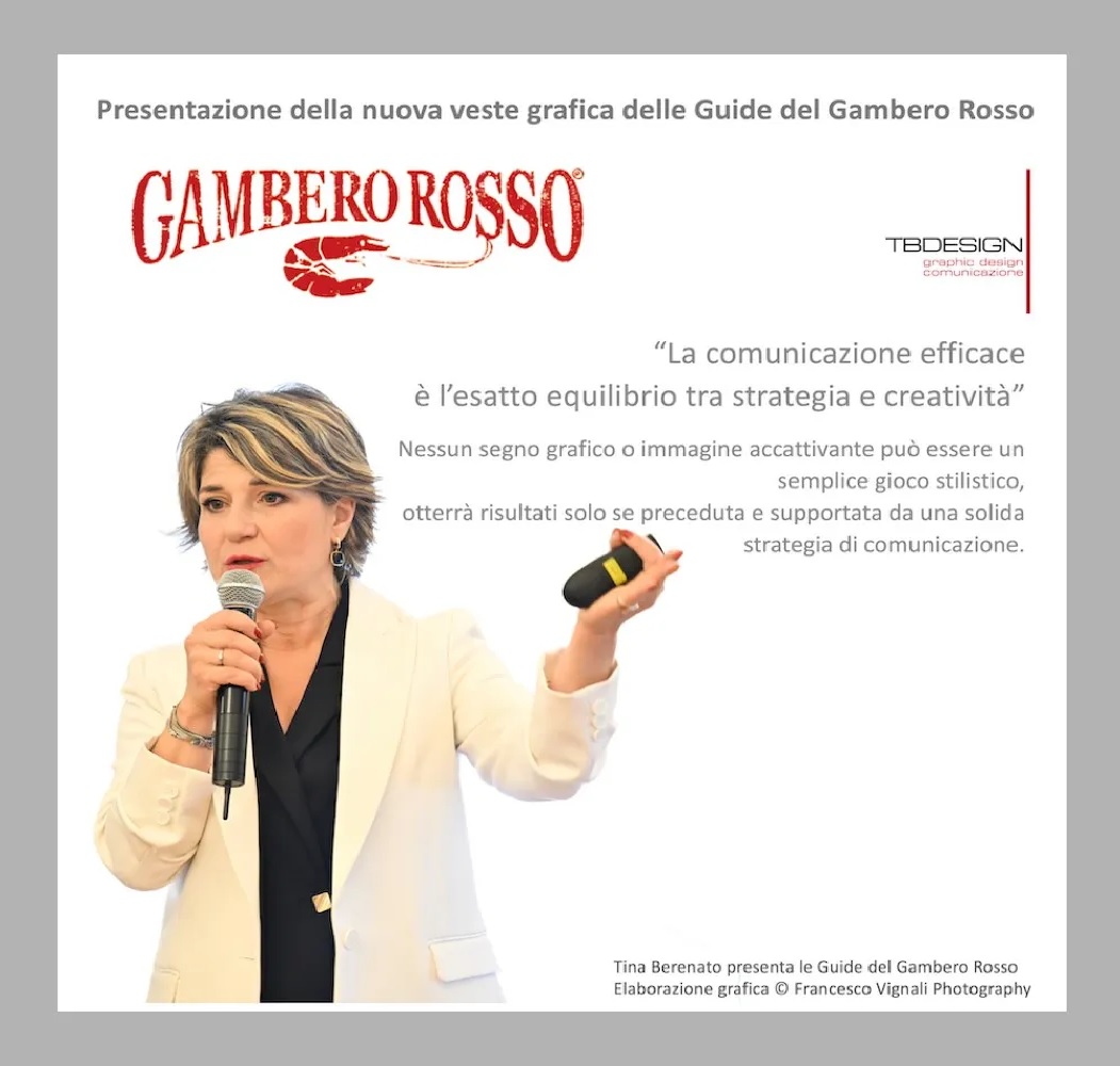 Il restyling è stato affidato a Tina Berenato, designer e titolare di TB Design, che ha presentato a Roma, nel raffinato Palazzo Brancaccio, la sua proposta creativa ad un pubblico d’eccellenza, primi fra tutti Marco Mensurati, il nuovo direttore responsabile delle Guide del Gambero Rosso, e Laura Mantovano, direttrice editoriale. “Per i saluti finali, che hanno preceduto l’aperitivo nel giardino, sono intervenuti anche Paolo Cuccia, Presidente, e Carlo Spallanzani, AD”, come si legge nell’edizione Roma del Corriere della Sera.