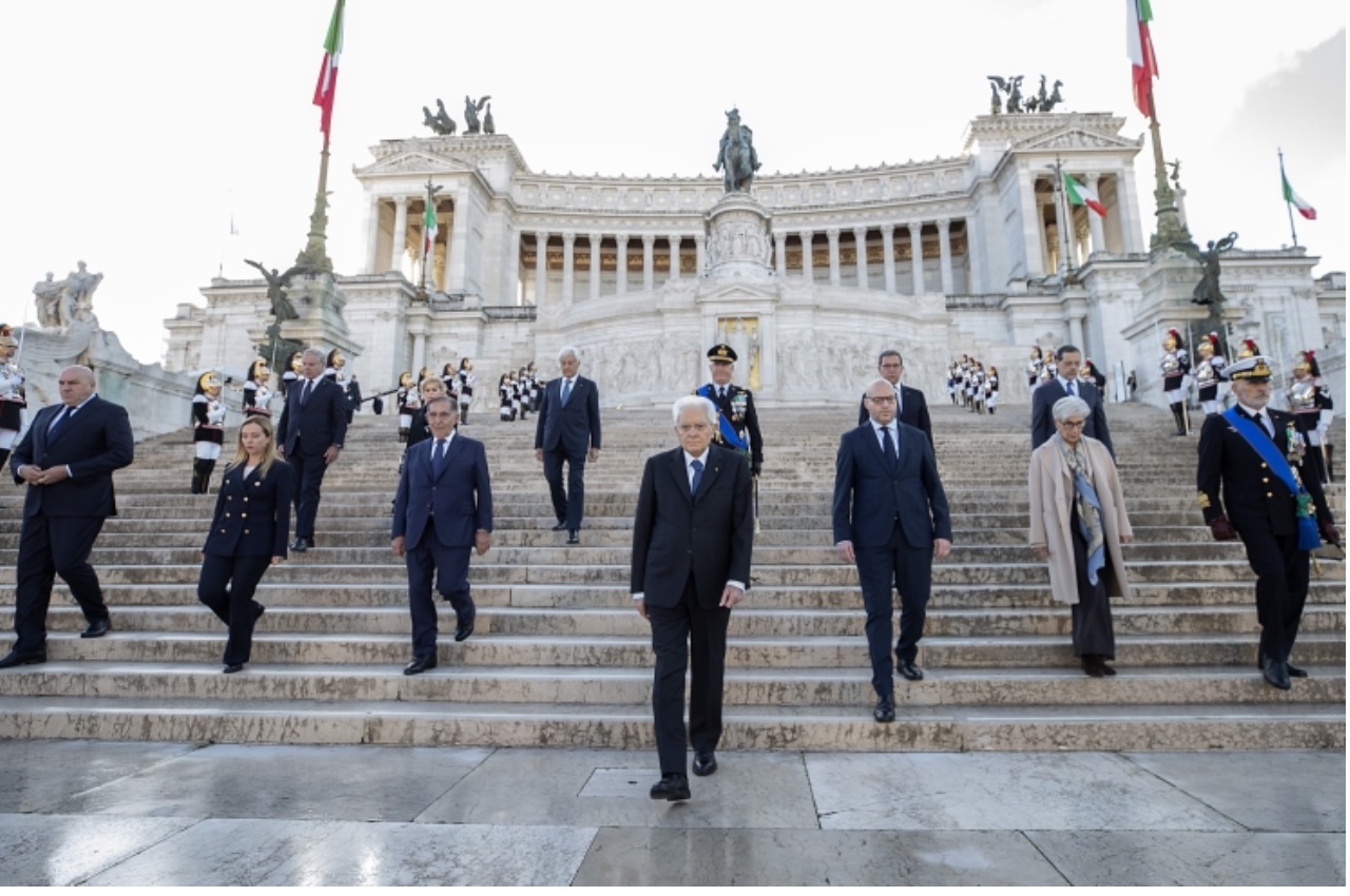 Il Presidente della Repubblica Sergio Mattarella ha deposto una corona d’alloro sulla tomba del Milite Ignoto al Vittoriano in occasione delle celebrazioni del 4 novembre, Giorno dell’Unità Nazionale e Giornata delle Forze Armate. Accompagnato dal Ministro della Difesa Guido Crosetto, il Capo dello Stato ha passato in rassegna i reparti schierati in Piazza Venezia.