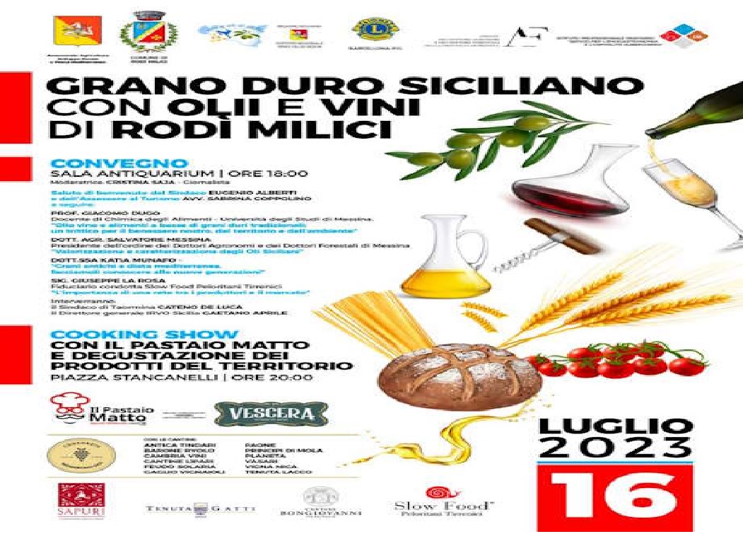 Il prossimo 16 luglio dalle ore 18.00 in poi e dopo i saluti dell’Amministrazione Comunale a cura del Sindaco Eugenio Aliberti e dell’Assessore al Turismo Sabrina Coppolino si terrà a Rodi Milici il convegno dal tema: “Grano Duro Siciliano con olii e Vini di Rodì Milici”.