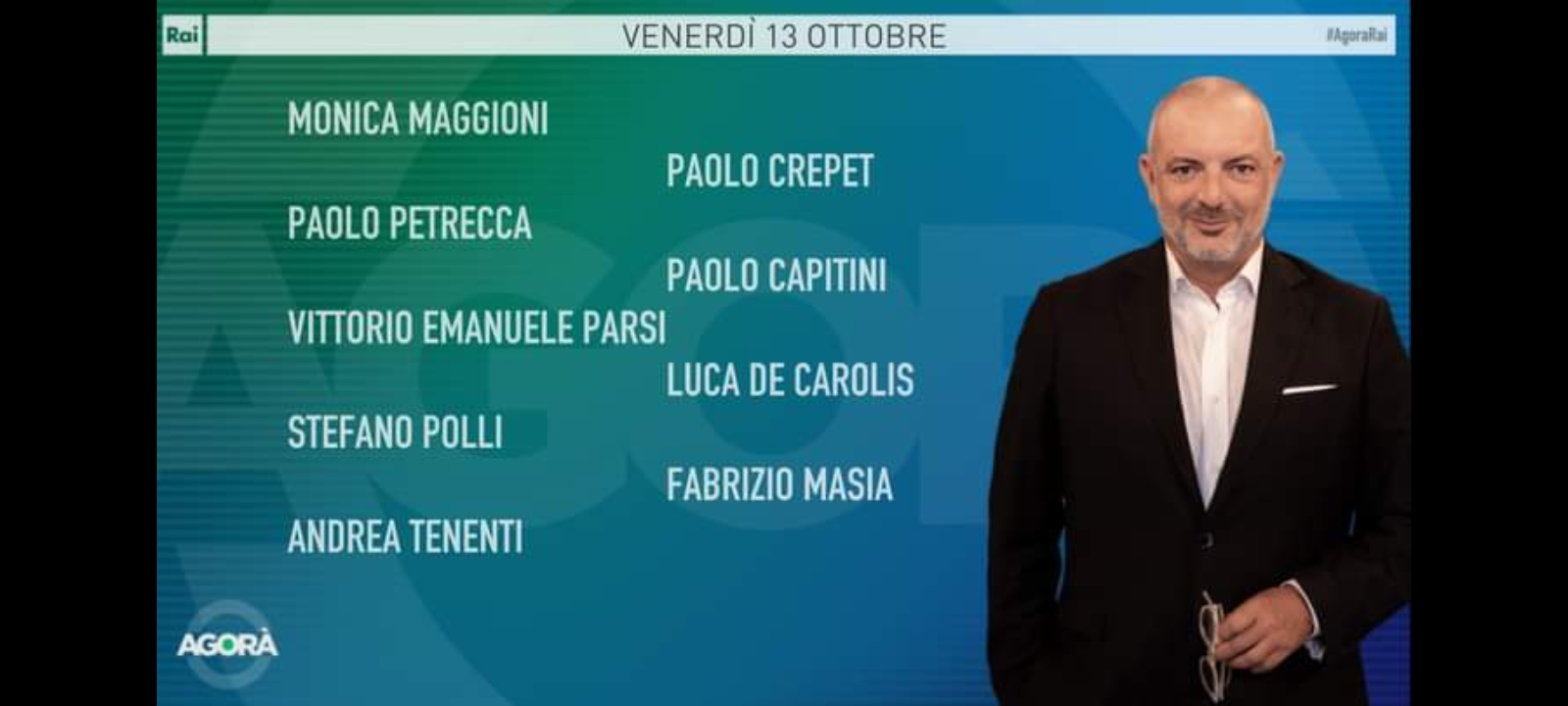Ospiti di Roberto Inciocchi saranno: ‘Monica Maggioni, giornaliste e conduttrice “In mezz’ora”; Stefano Polli, vicedirettore Ansa; Paolo Petrecca, direttore Rainews24; Luca De Carolis, Il Fatto Quotidiano; Andrea Tenenti, portavoce missione Unifil; Paolo Capitini, generale dell’Esercito e docente di storia militare; Vittorio Emanuele Parsi, docente Relazioni internazionali, Università Cattolica del Sacro Cuore; Maayan Taharani, testimone israeliana della guerra; Fabrizio Masia, sondaggista; Paolo Crepet, psichiatra e scrittore’.