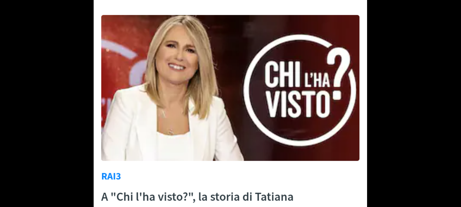 ‘In diretta da Nardò per la storia di Tatiana. La ragazza era scomparsa per 11 giorni prima di essere ritrovata nella soffitta dell’amico. Proprio quell’amico che, intervistato da Raffaella Griggi, aveva detto: “Non le ho fatto del male. Spero che torni, ci manca a tutti”. Tutta l’Italia si era preoccupata insieme ai familiari per la sorte di questa giovane e ora ci si interroga su cosa sia successo in quei giorni. Testimonianze inedite a “Chi l’ha visto?”; e poi la scomparsa di Domenico Manzo che si allontana arrabbiato durante la festa di compleanno della figlia Romina. Tra pochi giorni l’udienza preliminare: sono imputati per sequestro due amici di Romina e per favoreggiamento Romina stessa che sarà in studio in diretta a “Chi l’ha visto?”: “Non c’entro nulla, sono la prima a voler sapere cosa è successo a mio padre”‘. Questi sono alcuni dei temi di “Chi l’ha visto?”, con la conduzione di Federica Sciarelli, nella puntata che è iniziata in onda mercoledì 10 dicembre, alle 21.20 su Rai3.