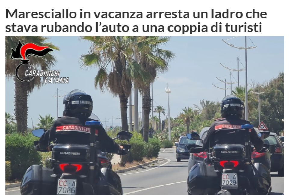 In ferie a Catania da Firenze assiste al tentato furto di un’auto e blocca il ladro salvando la vacanza ad una coppia di ignari turisti polacchi: un Maresciallo dei Carabinieri libero dal servizio ha arrestato un ladro d’auto che non si era accorto che ad osservarlo ci fosse proprio un sottufficiale dell’arma sia pure in borghese. Lo ha fatto con il supportato dei colleghi del Nucleo Radiomobile di Catania.