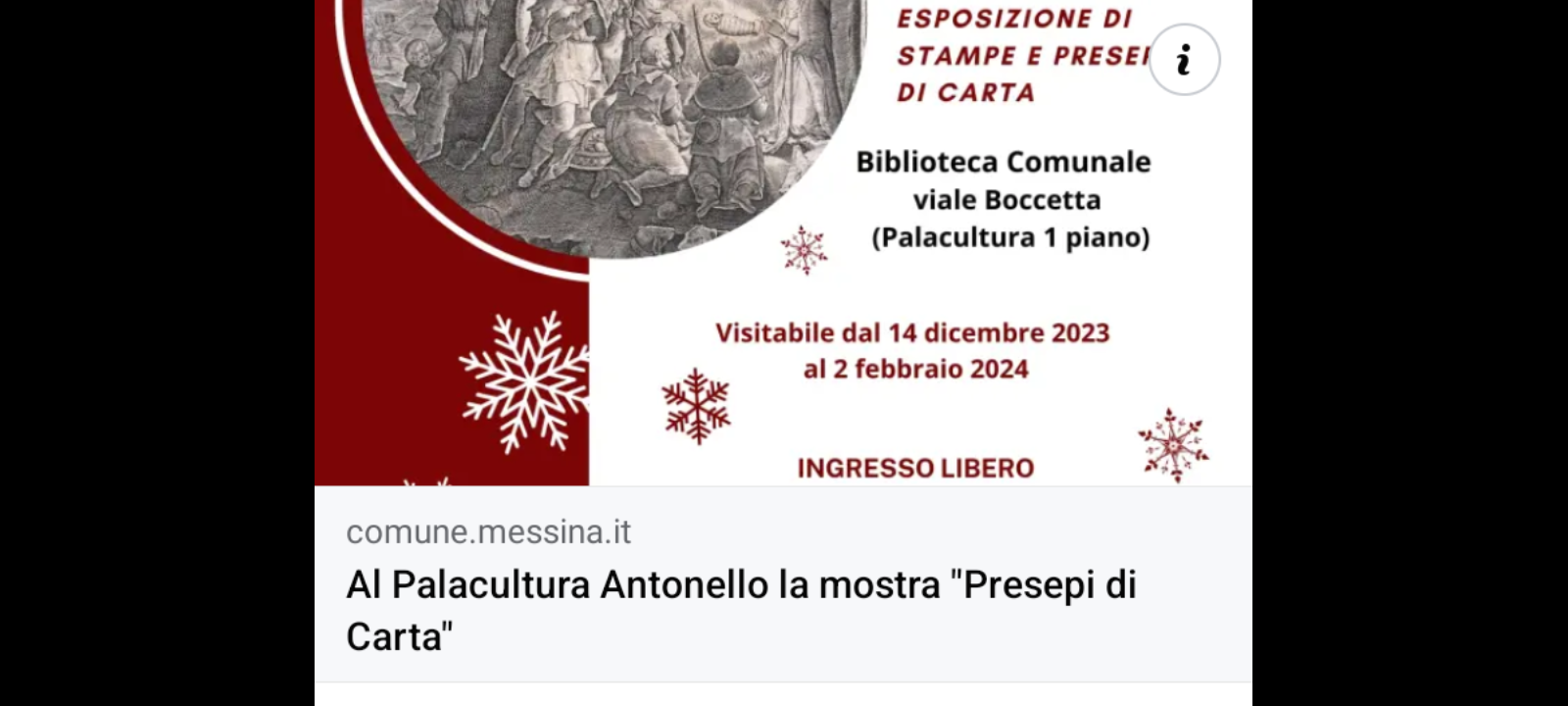In occasione delle feste natalizie, la Biblioteca comunale “Cannizzaro”, in collaborazione con l’assessorato alla Cultura e l’associazione Italiana “Amici del Presepe” sezione di Messina, ha allestito una mostra di stampe sulla Natività, immaginette e presepi di carta.