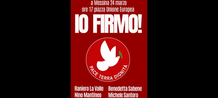 “IO FIRMO ➡️ l’iniziativa di lancio della raccolta delle firme di #PaceTerraDignità per le prossime #elezionieuropee”! A scriverlo oggi 24 marzo 2024, sui suoi Spazi Facebook, è stato il giornalista di ‘Servizio Pubblico’… Michele Santoro…; a Messina…, l’appuntamento è in data odierna alle ore 17.00 in piazza Unione Europea.