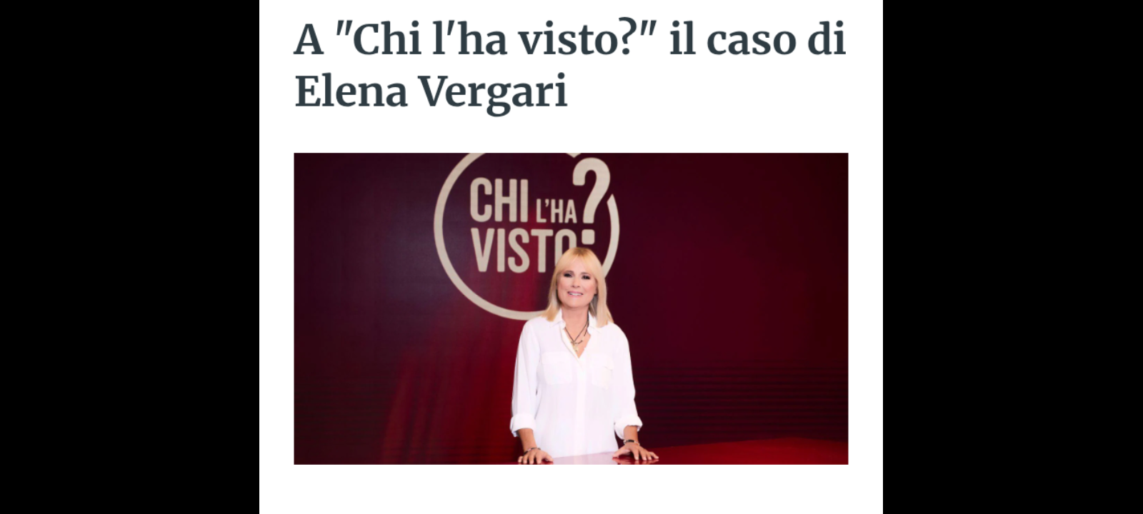 ‘La scomparsa di Elena Vergari: una lettera anonima indica dove sarebbe stata occultata… la mamma di Ladispoli non si sarebbe allontanata in compagnia di un uomo con la Mercedes, ma sarebbe stata uccisa; e poi la scomparsa di Nicola: fa vedere a tutto il paese le foto di una giovane e bella donna. È caduto in una trappola? È da metà agosto che nessuno ha più sue notizie; “Sono una accumulatrice seriale” dice a “Chi l’ha visto?” la donna che ha causato disagio ai condomini costretti a convivere con sacchi di spazzatura… il programma di Rai3 aveva risposto alla richiesta di aiuto da parte di alcuni cittadini con una diretta mercoledì scorso… e ora si cerca di risolvere il problema’. Sono questi, i temi di “Chi l’ha visto?” (con documenti inediti), la trasmissione condotta da Federica Sciarelli, in onda mercoledì 17 settembre, alle 21.20 su Rai3.