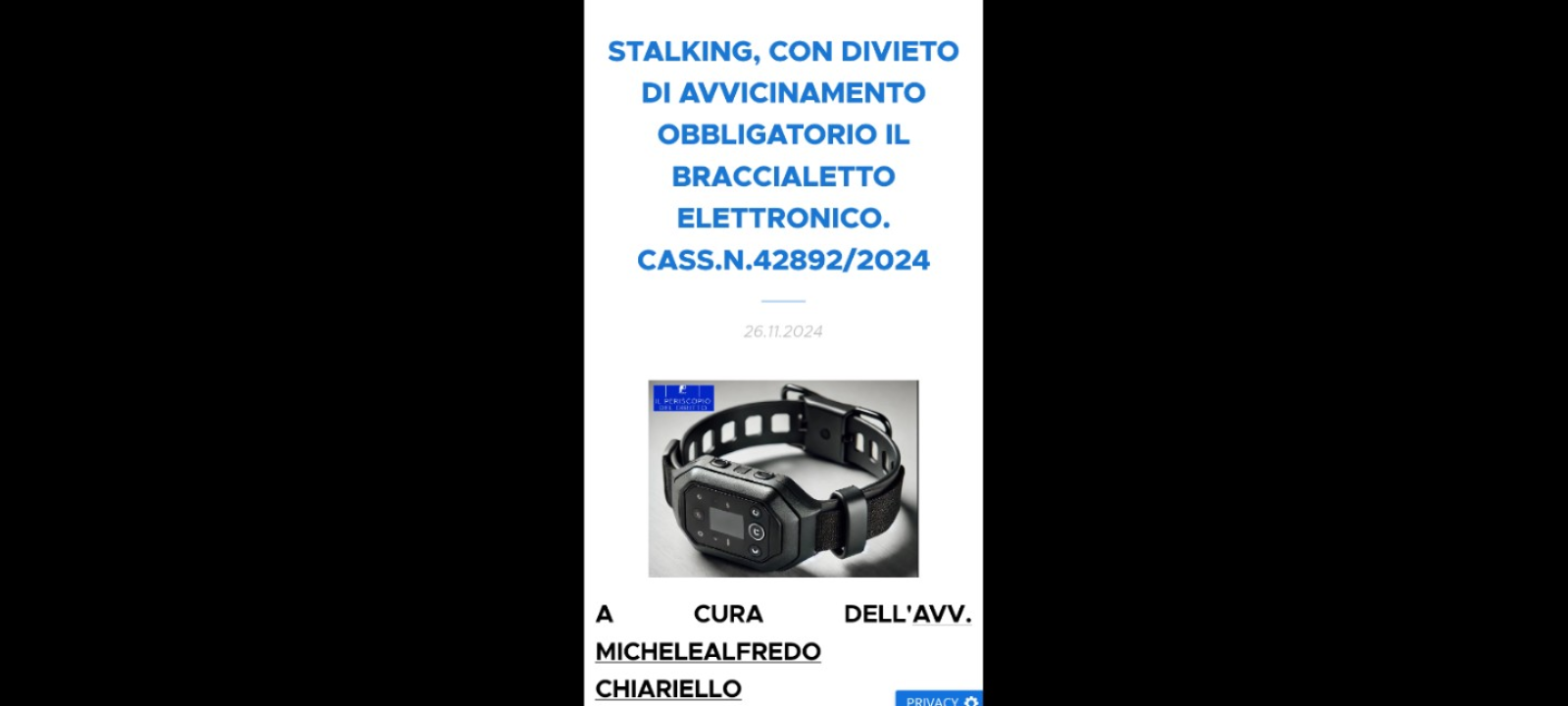 STALKING, CON DIVIETO DI AVVICINAMENTO: OBBLIGATORIO IL BRACCIALETTO ELETTRONICO... CASS. N. 42892/2024 A CURA DELL’AVV. MICHELEALFREDO CHIARIELLO