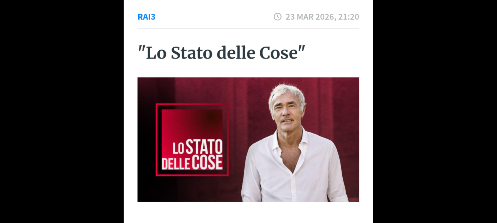 ‘La stretta attualità politica e internazionale con Michele Santoro; e ancora: riflettori sempre accesi sul fallito trapianto del piccolo Domenico morto al Monaldi di Napoli. Due chirurghi che lo hanno operato sono indagati, oltre che per omicidio colposo, anche per falso ideologico: secondo la Procura avrebbero tentato di occultare alcuni dettagli della cartella clinica del bambino. Ospiti Patrizia, la mamma di Domenico, il suo avvocato Francesco Petruzzi e Giuseppe Crimaldi, il cronista de “Il Mattino” che ha portato alla luce il caso; continua l’inchiesta sul delitto di Garlasco con il colpo di scena sulle indiscrezioni riguardo la consulenza della professore Cattaneo: Chiara si sarebbe difesa prima di morire. I tempi dell’aggressione si allungano? E il Dna sulle unghie assume un valore diverso? E poi tutti i misteri irrisolti sulla scena del crimine e il giallo degli audio misteriosi ricevuti dalla criminologa Roberta Bruzzone. In studio Liborio Cataliotti, legale di Sempio, Antonio De Rensis, legale di Stasi, Luciano Garofano ex comandante dei Ris e Umberto Brindani direttore di “Gente”’. Sono questi, alcuni dei temi della puntata del programma di Massimo Giletti “Lo Stato delle Cose” che è iniziato in onda lunedì 23 marzo alle 21.20 su Rai3.