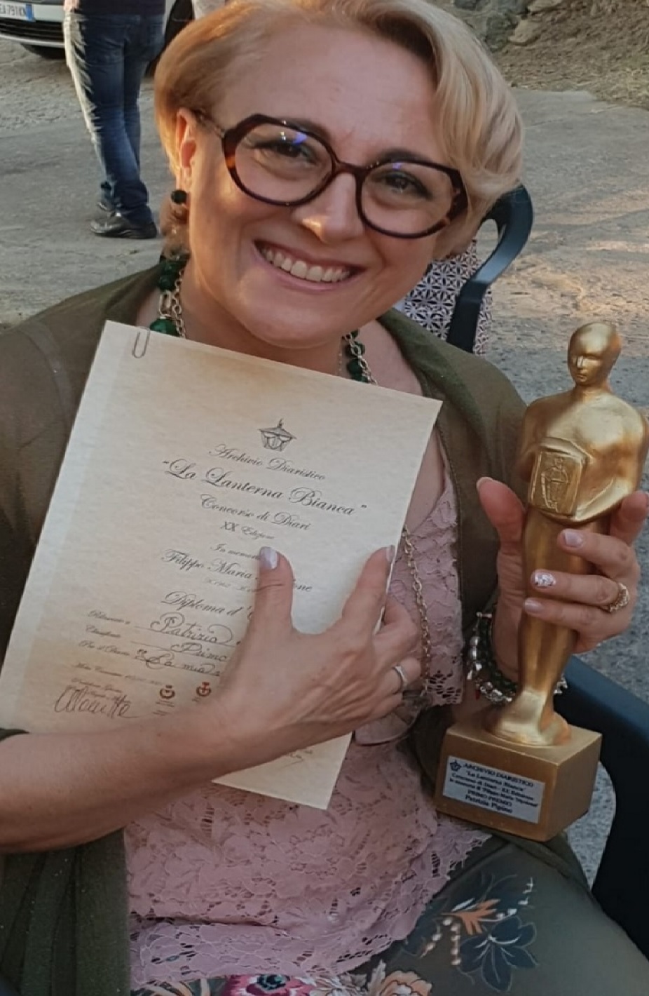 Patrizia invece…, emozionata per questa ulteriore vittoria da parte sua ha dichiarato che: “il suo -Oltre- è anche questo. Questa vittoria in terra di Sicilia, è per me motivo di orgoglio e commozione. Essere premiata è sempre un ulteriore arricchirsi dentro, è portare a casa oltre il Premio, nel più profondo di me, le storie di altre persone che incrociano il mio cammino, se pur per breve tempo, e in questo caso, dato che il Concorso indetto era per il miglior Diario, ho portato a casa storie vere intense ed emozionanti. Ringrazio di cuore, la signora Ada Nunzia De Cola per l’accoglienza, la giuria tutta per aver giudicato la mia opera vincente e il Sindaco di Motta Camastra per avermi premiata. L’emozione che ho provato è stata indescrivibile e questo Premio non è solo mio ma è anche di chi combatte ogni giorno la sua battaglia contro il cancro e comunque trova la forza e il coraggio di andare avanti”.
