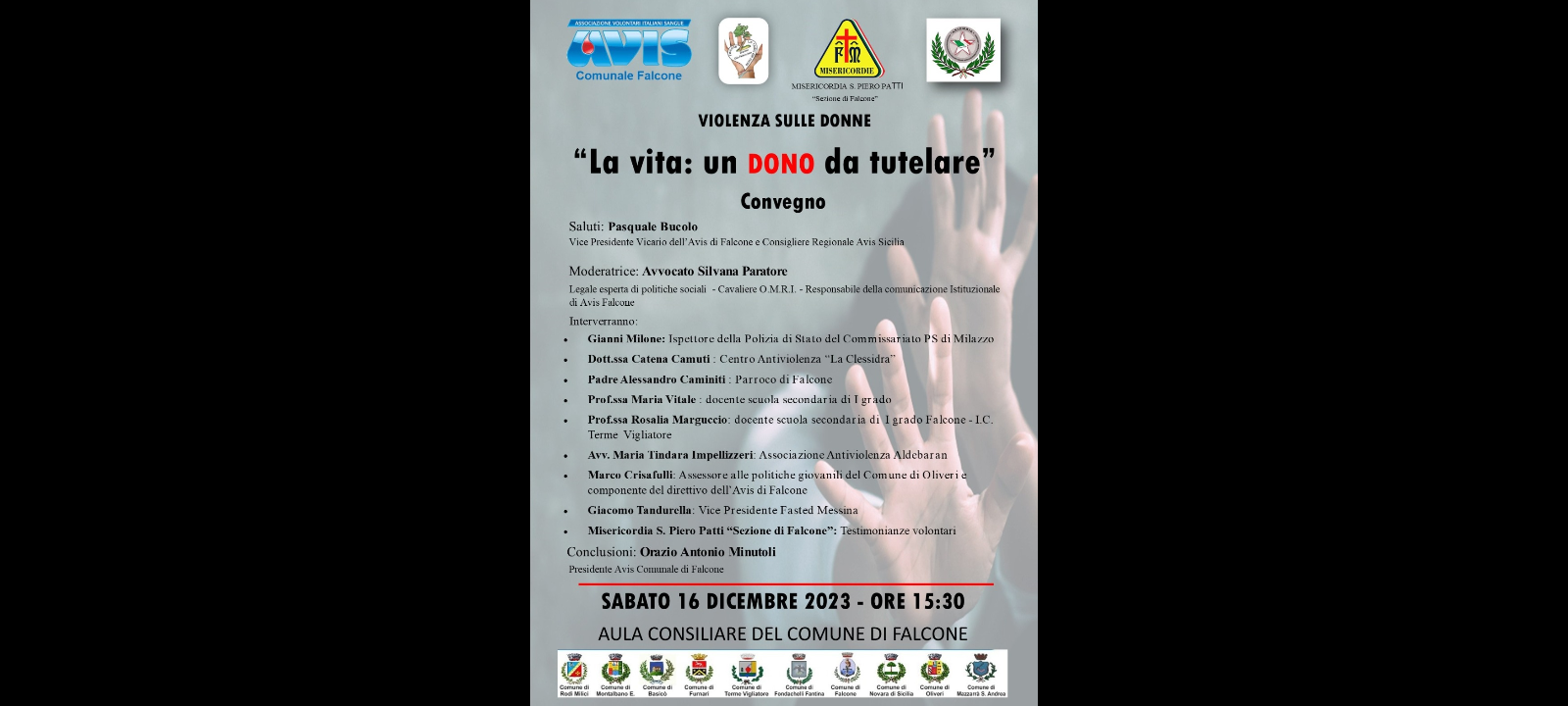 Si svolgerà sabato 16 dicembre 2023 con inizio alle ore 15:30 nell’Aula Consiliare del Comune di Falcone il convegno sul tema… Violenza sulle donne ‘La vita: Un DONO da tutelare”.