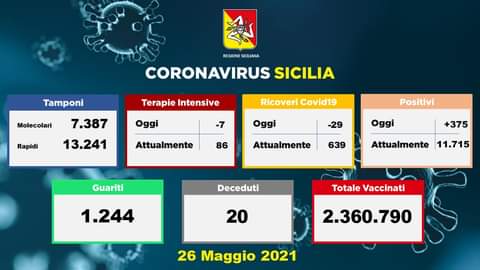 Il dato dei ricoveri oggi per #Coronavirus negli ospedali siciliani rispetto a ieri vede un decremento complessivo di 29 unità, così come riporta il bollettino quotidiano del Ministero della Salute. In terapia intensiva sono in cura 86 persone (7 in meno rispetto a ieri). Il dato dei guariti è pari a 1244 persone. 20 i decessi. I nuovi soggetti positivi rilevati sono 375. I tamponi molecolari processati sono stati 7387. I tamponi rapidi sono stati 13241. Le dosi di vaccino complessivamente inoculate sono 2360790