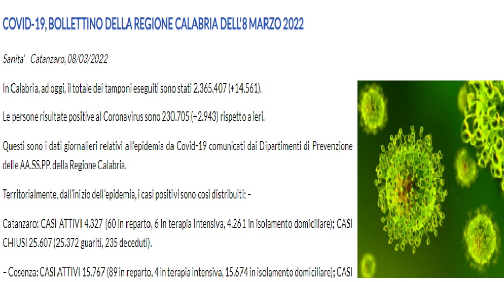COVID-19: IL BOLLETTINO DELLA REGIONE CALABRIA DELL'8 MARZO 2022