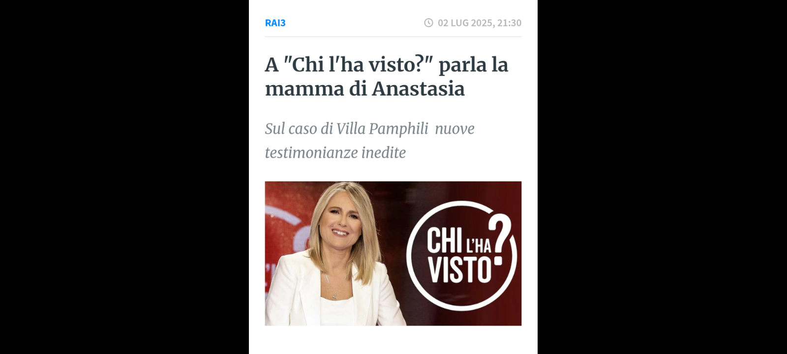 ‘L’orrore a Villa Pamphili parla la mamma di Anastasia, la giovane donna trovata morta nel parco assieme alla figlia di appena un anno. “Mia figlia mi disse che lo zainetto con i suoi documenti era caduto in mare nel viaggio da Malta verso l’Italia, ma a questo punto credo che sia stato lui a farle perdere i documenti. Mia figlia era in balia di quest’uomo, che le aveva tolto anche la sim russa con la quale era partita” Sul caso, nuove testimonianze inedite’. Questi alcuni dei temi, a “Chi l’ha visto”, che è iniziato in onda oggi alle 21.20 su #Rai3, con la conduzione di Federica Sciarelli.