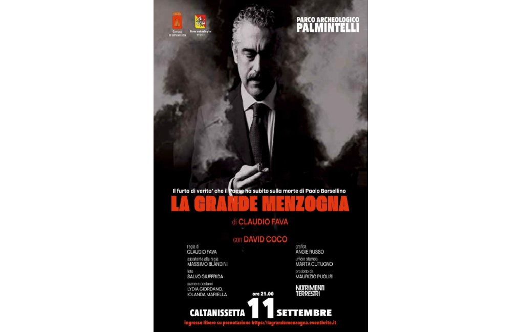 Lunedì 11 settembre, “La Grande Menzogna”, spettacolo di Claudio Fava interpretato da David Coco e prodotto da Nutrimenti Terrestri, andrà in scena al Parco Archeologico Palmintelli nel cuore di Caltanissetta. Dopo il debutto dello scorso luglio al Tindari Festival e la successiva tappa messinese al Cortile Teatro Festival, i fatti, le contraddizioni e i misteri che ruotano attorno al depistaggio Borsellino giungono nel nisseno grazie all’ultimo lavoro teatrale di Fava ed in un luogo particolarmente simbolico.
