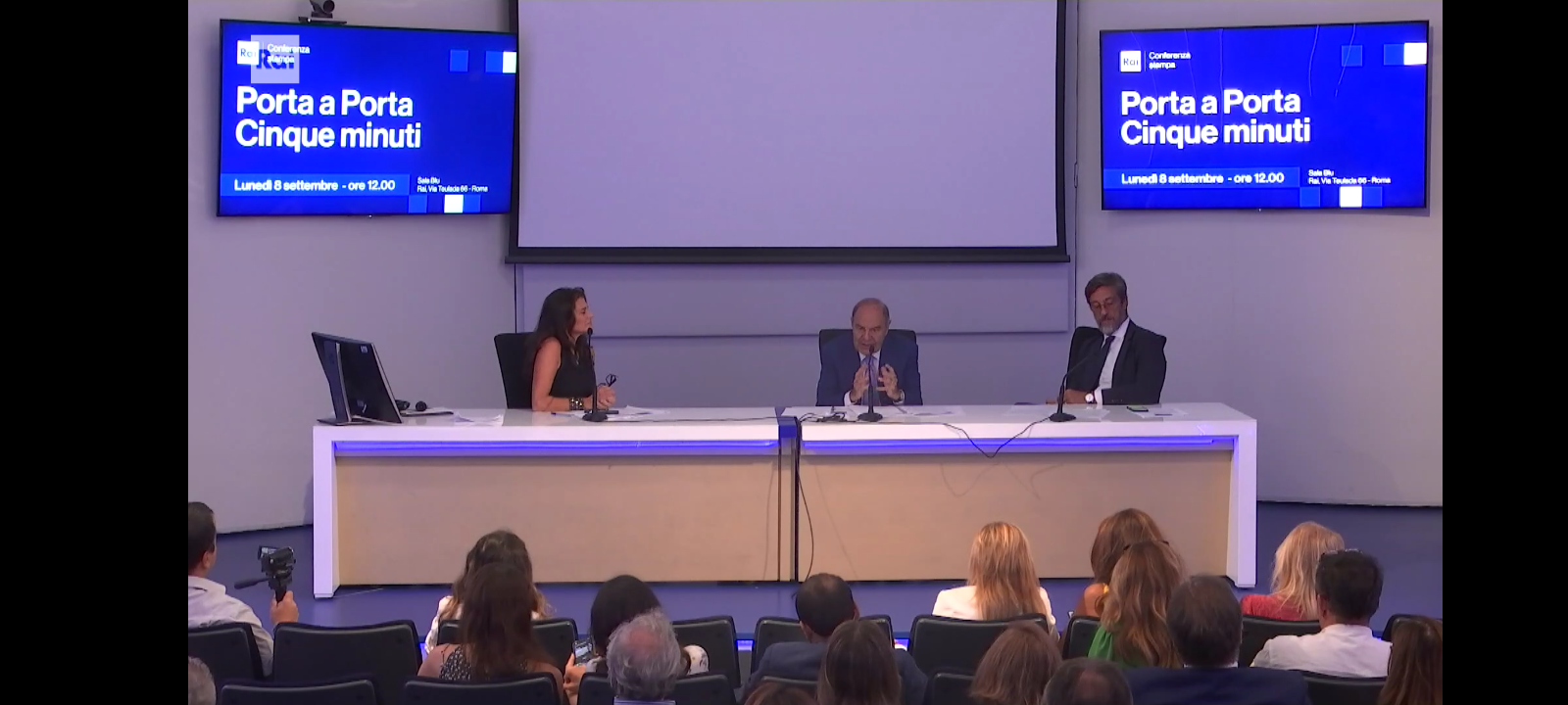 Lunedì 8 settembre alle ore 12.00 – presso la Sala Blu della Rai di Via Teulada 66 – Roma è iniziata la Conferenza Stampa relativa ai programmi di Rai1, ‘Porta a Porta e ‘Cinque Minuti’, condotti dal giornalista Bruno Vespa.