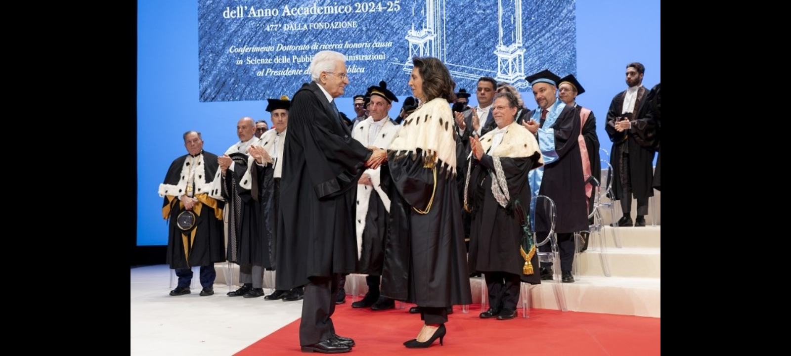 La consegna al Presidente Mattarella del diploma di Dottorato honoris causa e del sigillo dell’Ateneo è stata preceduta dalla lettura delle motivazioni del conferimento da parte Daniela Novarese, Coordinatrice del Corso di Dottorato in Scienze delle Pubbliche Amministrazioni e dalla proclamatio doctoralis honoris causa da parte della Rettrice dell’Ateneo. La cerimonia si è conclusa con la Lectio doctoralis del Presidente della Repubblica.