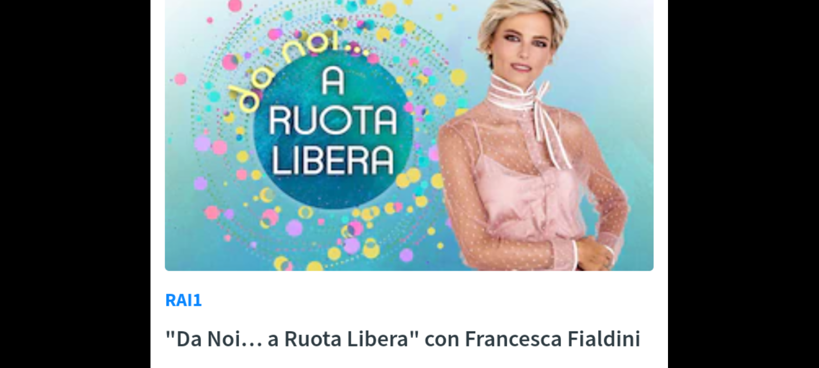 In ogni puntata di “Da noi… a Ruota Libera”, Francesca Fialdini racconta la vita artistica e privata di personaggi celebri e non che hanno saputo imprimere un “giro di Ruota” originale e positivo alla propria vita e a quella degli altri compiendo scelte coraggiose e anticonvenzionali. Un percorso di emozioni, ricordi, riflessioni, momenti d’ironia e leggerezza attraverso formule d’interazione sempre nuove e coinvolgenti tra gli ospiti e la conduttrice.
