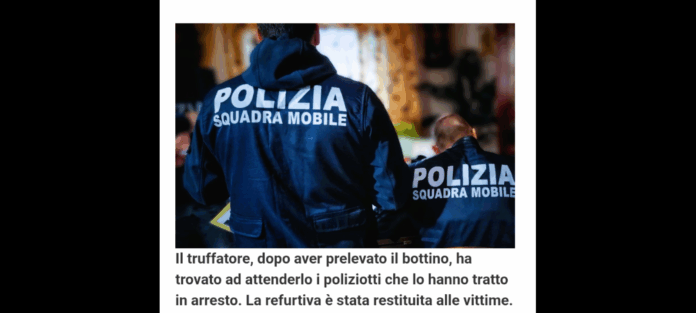 La segnalazione ha consentito l’immediato intervento dei poliziotti in borghese della Squadra Mobile, che si sono appostati nei pressi dell’abitazione degli anziani. Decisiva anche la cinturazione della zona operato dagli agenti della Squadra Volante, utile a impedire ogni possibile via di fuga del truffatore. L’operazione ha consentito di cogliere l’arrivo di un individuo, il quale, spacciandosi per l’incaricato del prelievo, si è effettivamente fatto consegnare dalle vittime le fedi in oro e altri oggetti di valore.