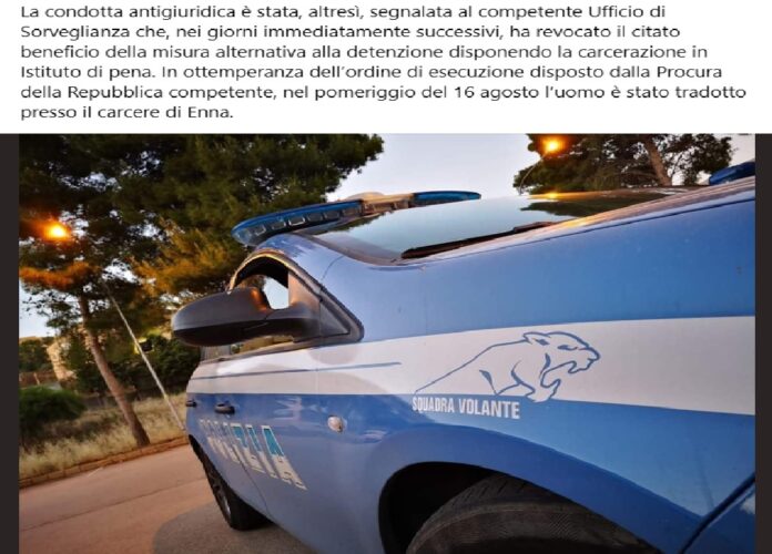 La condotta antigiuridica è stata, altresì, segnalata al competente Ufficio di Sorveglianza che, nei giorni immediatamente successivi, ha revocato il citato beneficio della misura alternativa alla detenzione disponendo la carcerazione in Istituto di pena. In ottemperanza dell’ordine di esecuzione disposto dalla Procura della Repubblica competente, nel pomeriggio del 16 agosto l’uomo è stato tradotto presso il carcere di Enna.