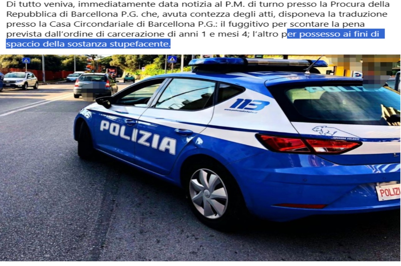 Di tutto veniva, immediatamente data notizia al P.M. di turno presso la Procura della Repubblica di Barcellona P.G. che, avuta contezza degli atti, disponeva la traduzione presso la Casa Circondariale di Barcellona P.G.: il fuggitivo per scontare la pena prevista dall’ordine di carcerazione di anni 1 e mesi 4; l’altro per possesso ai fini di spaccio della sostanza stupefacente.