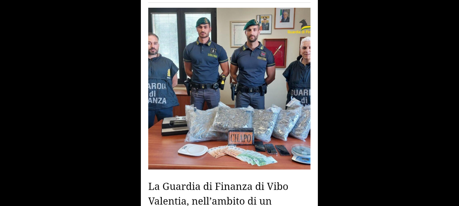 Nelle ore scorse…, la Guardia di Finanza di Vibo Valentia, nell’ambito di un servizio a contrasto del traffico e spaccio di sostanze stupefacenti a Filandari (VV), frazione Mesiano, ha controllato un’autovettura condotta da un uomo di Tropea, rinvenendo a bordo più di 5 chilogrammi di marijuana, abilmente occultati all’interno di scatole di cartone contenenti libri scolastici