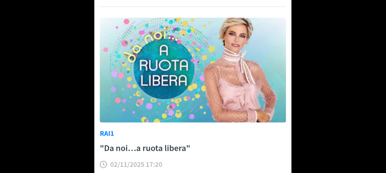 Nuovo appuntamento con “Da noi… a ruota libera”, in onda domenica 2 novembre alle 17.20 su Rai1. Al centro del programma, le interviste di Francesca Fialdini ai protagonisti più attuali del mondo dello spettacolo e i racconti di storie vere, forti ed esemplari di persone comuni che hanno saputo dare una svolta alla loro vita, rimettendosi in gioco e riuscendo a far girare la ruota, metafora di rinascita, cambiamento e coraggio.