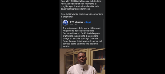 - “A quasi un anno dalla morte di Giovanni Arigò morto nell’esplosione della fabbrica di fuochi d’artificio della quale era titolare, la comunità di Bordonaro piange un altro dei suoi figli, Gabriele Cavò. Il dolore dei giovani nelle parole del parroco padre Severino che abbiamo sentito”.