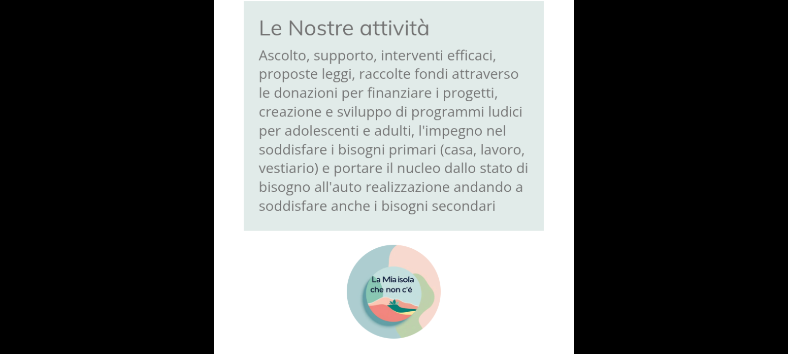 Ascolto, supporto, interventi efficaci, proposte leggi, raccolte fondi attraverso le donazioni per finanziare i progetti, creazione e sviluppo di programmi ludici per adolescenti e adulti, l’impegno nel soddisfare i bisogni primari (casa, lavoro, vestiario) e portare il nucleo dallo stato di bisogno all’auto realizzazione andando a soddisfare anche i bisogni secondari
