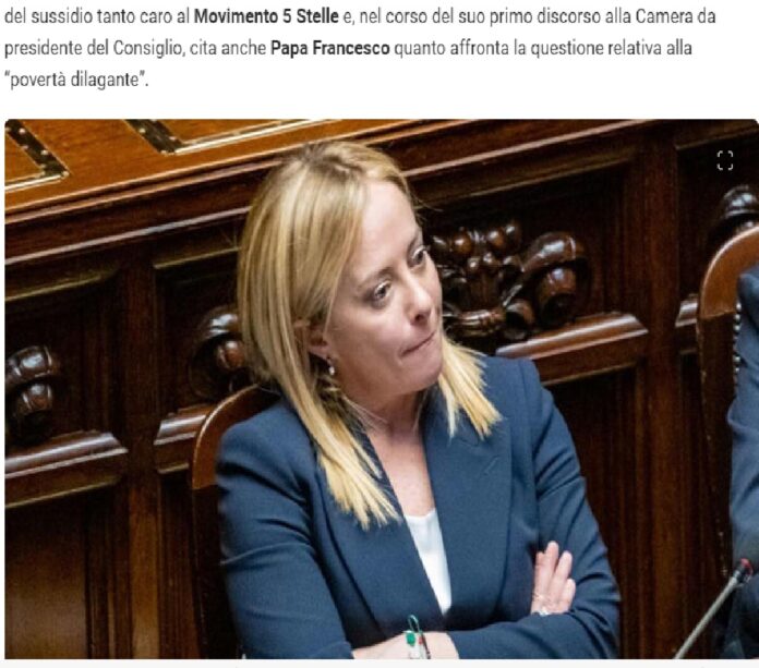 “Per come è stato pensato, il reddito di cittadinanza ha rappresentato una sconfitta” e “vogliamo mantenere e, laddove possibile, aumentare il doveroso sostegno economico per i soggetti effettivamente fragili non in condizioni di lavorare” ma “per gli altri la soluzione non può essere il reddito di cittadinanza ma il lavoro”. La premier Giorgia Meloni annuncia una revisione quasi totale del sussidio tanto caro al Movimento 5 Stelle e, nel corso del suo primo discorso alla Camera da presidente del Consiglio, cita anche Papa Francesco quanto affronta la questione relativa alla “povertà dilagante”.