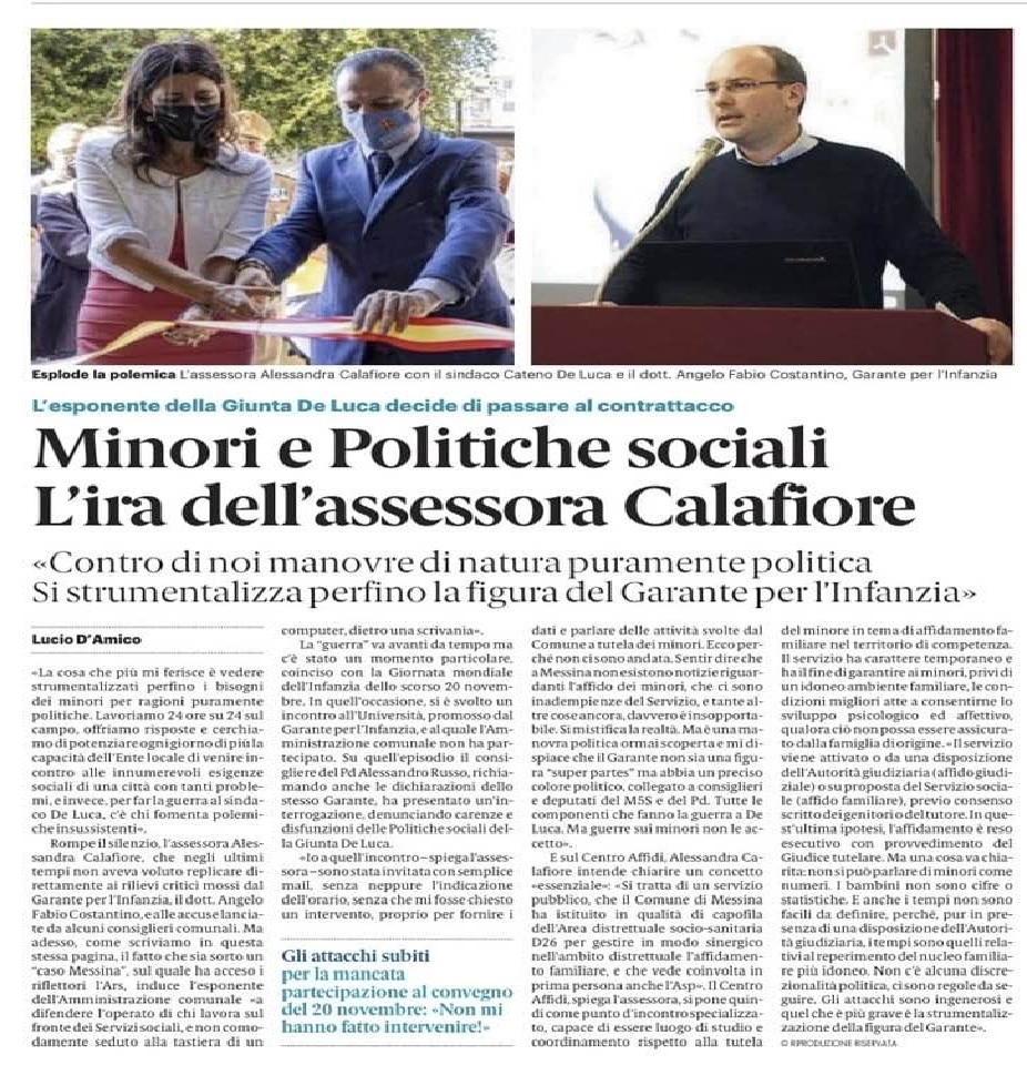 - “la polemica sul sistema degli affidamenti familiari non nasce da una presa di posizione del Garante dell’Infanzia ma da una precisa e circostanziata richiesta/denuncia dell’Autorita’ Giudiziaria inoltrata al Comune di Messina in data 15/10/2021 che ho volutamente segretato per rispetto alla Magistratura. Di questa missiva il Sindaco di Messina è venuto a conoscenza dal sottoscritto, in data 21/11/21 per tramite dell’assessore Musolino. In una telefonata intercorsa con l’assessore Musolino in merito alla possibilità di partecipare al tavolo tecnico indetto dal suo Assessorato sul contrasto all’abuso di alcool tra i minori, mi sono permesso di sollecitarla a velocizzare la trasmissione degli atti richiesti dal Tribunale. È prassi del Garante e rientra nel suo mandato Istituzionale farsi tramite tra gli enti Istituzionali, facilitarne il dialogo velocizzando, ove possibile, l’iter amministrativo. È successo in questa situazione e continuerà a succedere”;