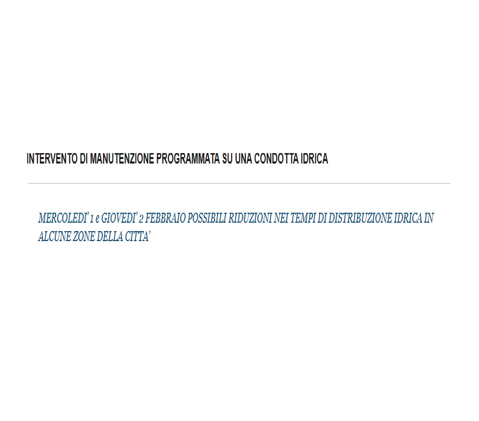 Per un intervento di manutenzione programmata su una condotta idrica, volto ad eliminare una rilevante perdita, e quindi a migliorare la qualità del servizio, si renderà necessario ridurre la distribuzione in rete e potranno riscontrarsi contrazioni dei consueti tempi di distribuzione idrica
