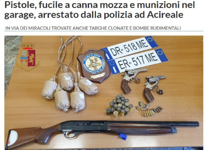 Pistole calibro 38, un fucile a canne mozze calibro 12 con matricole abrase o mancanti, munizioni, targhe clonate ritrovate assieme a 5 bombe artigianali di “spiccata potenzialità offensiva” in un garage di un cortile condominiale in via dei Miracoli ad Acireale. Gli agenti del commissariato di pubblica sicurezza di Acireale e della squadra mobile di Catania hanno arrestato un 53enne acese, già noto alle forze dell’ordine.