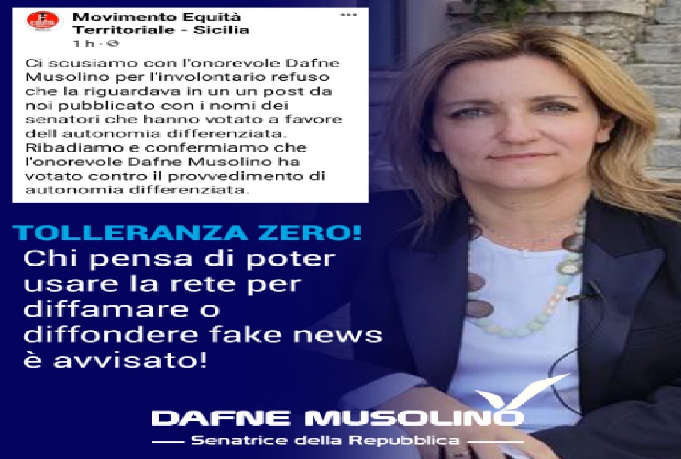 “Prima pubblicano un post con il mio nome additandomi alla gogna mediatica perché secondo loro avrei votato a favore dell’Autonomia Differenziata, cosa che ovviamente non solo non ho fatto, ma sono anche stata la relatrice della dichiarazione di voto contraria di tutta Italia Viva e non potevano non saperlo: Ho provato a contattarli ma niente, allora ho commentato il post chiedendo la rettifica e un post di scuse”. A riferirlo ieri 25 gennaio 2024 sui suoi omonimi Spazi Facebook, è stata la senatrice messinese Dafne Musolino, membro del Gruppo parlamentare del ‘Partito renziano’ presso ‘Palazzo Madama’ a Roma.