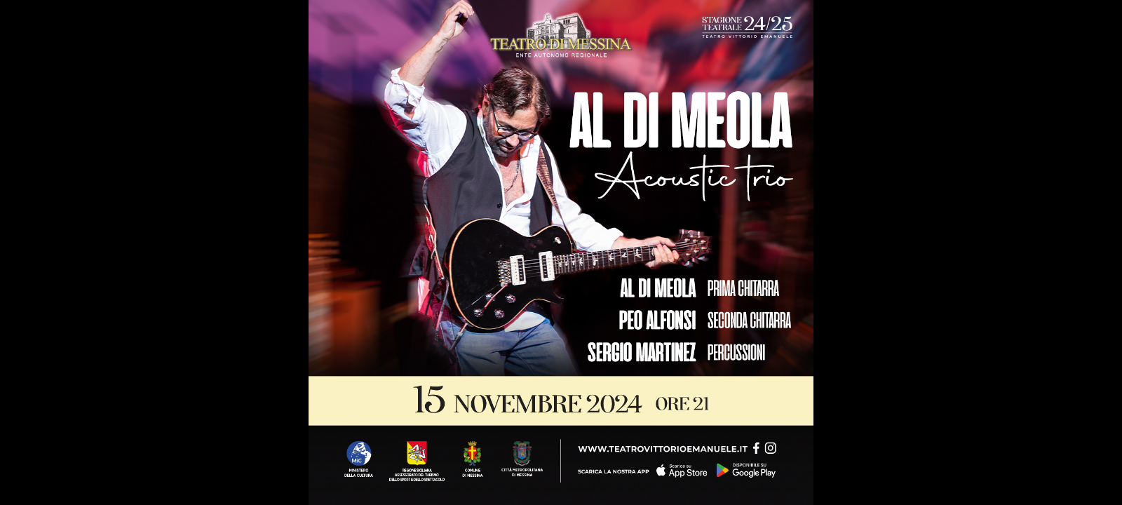 Prosegue con grande partecipazione di pubblico la Stagione musicale del Teatro Vittorio Emanuele di Messina che domani, venerdì 15 novembre, alle ore 21, accoglierà la performance di Al Di Meola, Acoustic trio in concerto.