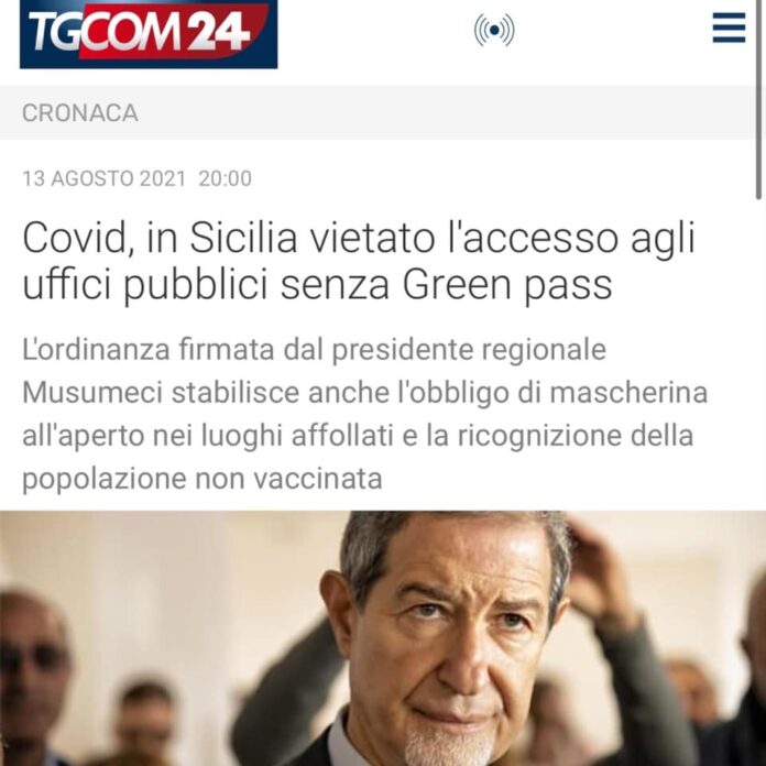 “Questa mattina mi sono svegliato e ho scoperto che il Presidente della mia regione, Nello Musumeci, ha deciso di imporre il green pass per entrare in qualsiasi ufficio pubblico, fregandosene del fatto che la nostra Costituzione tutela la libertà individuale e non può essere certamente derogata con un provvedimento regionale”. Ha scritto così oggi su Facebook, Enrico Rizzi storico leader del Partito Animalista di Trapani.