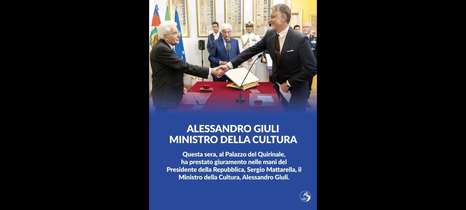 “Questa sera, al Palazzo del Quirinale, ha prestato giuramento nelle mani del Presidente della Repubblica, Sergio Mattarella, il Ministro della Cultura, Alessandro Giuli”. Lo si legge in un Post pubblicato nella odierna serata, sulla ‘Pagina Facebook’ del ‘Ministero della Cultura’
