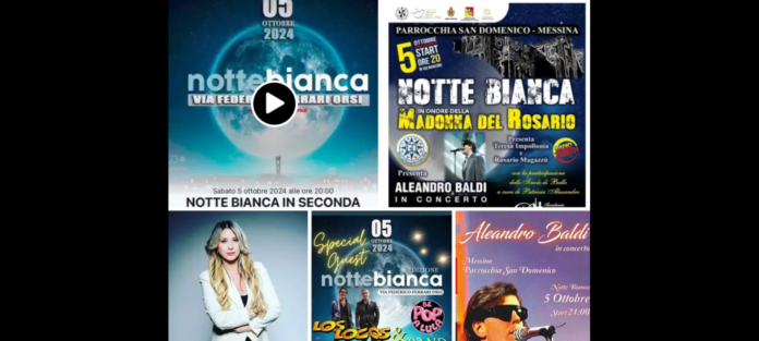 - “per la Notte Bianca di Messina avremo il Concerto del grandissimo Aleandro Baldi e poi scuole di ballo a cura di Patrizia Alessandro…, ancora animazione Priscilla con Mago Pepo e Mascotte il giovanissimo artista Italo Bartolomeo… e poi food e hobbisti”;