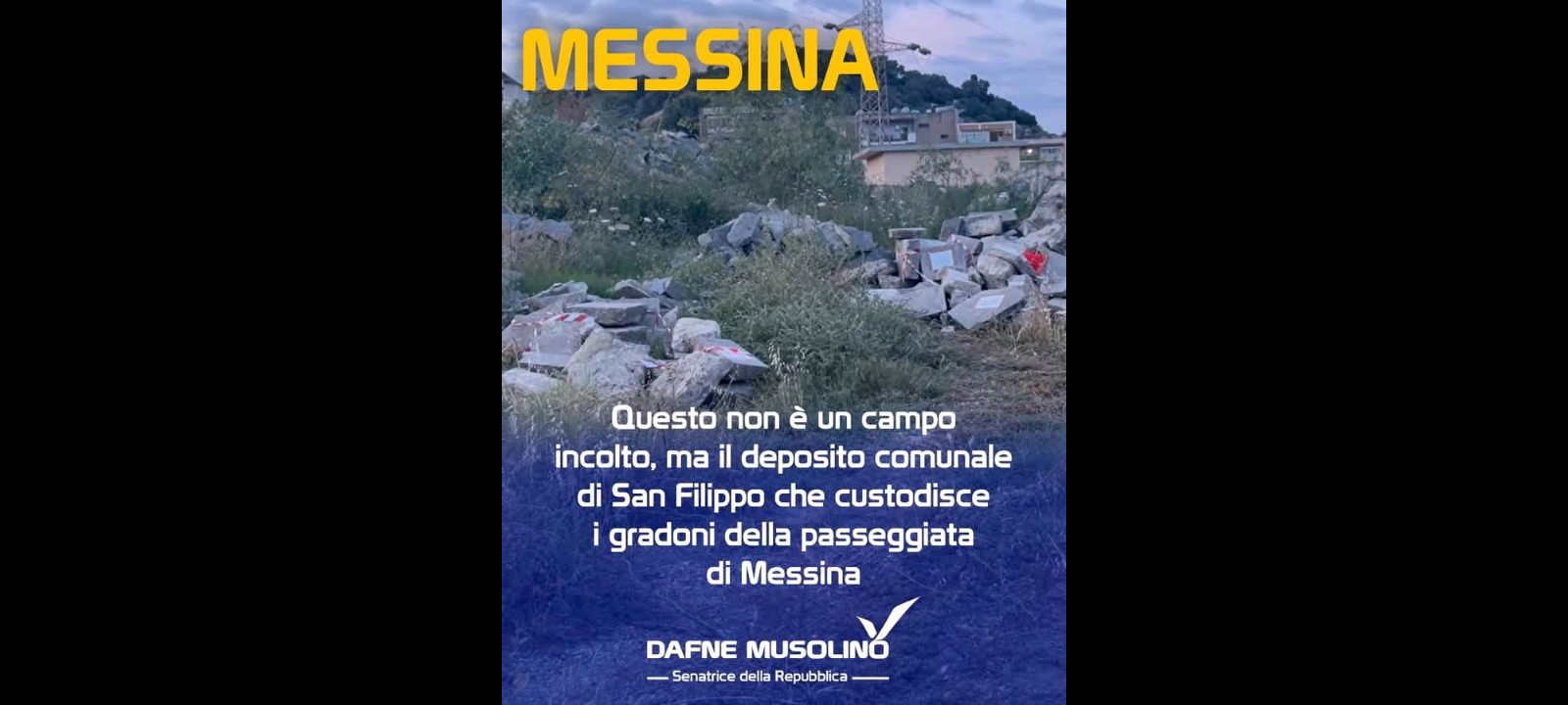 La Musolino continua: “Infine una riflessione… ma davvero un campo incolto posto a bordo strada può essere definito deposito comunale dove conservare i residui delle demolizioni? Sono sicura che se lo avesse fatto un privato cittadino sarebbe stato multato (e giustamente) per abbandono di rifiuti. Ma se lo fa il Comune…! Triste è il tempo in cui chi governa pensa di essere al di sopra della legge e che spiegare ai cittadini il suo operato sia un inutile fastidio…”!