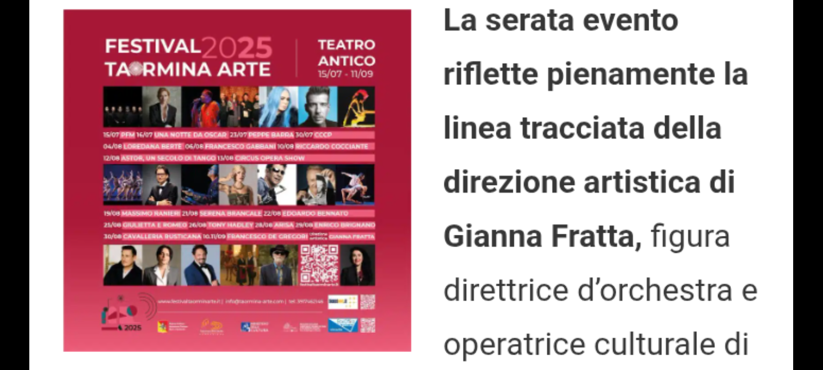- Info biglietti: ticket@taoarte.it / Info Festival Taormina Arte: info@taormina-arte.com – Tel. 3917462146.