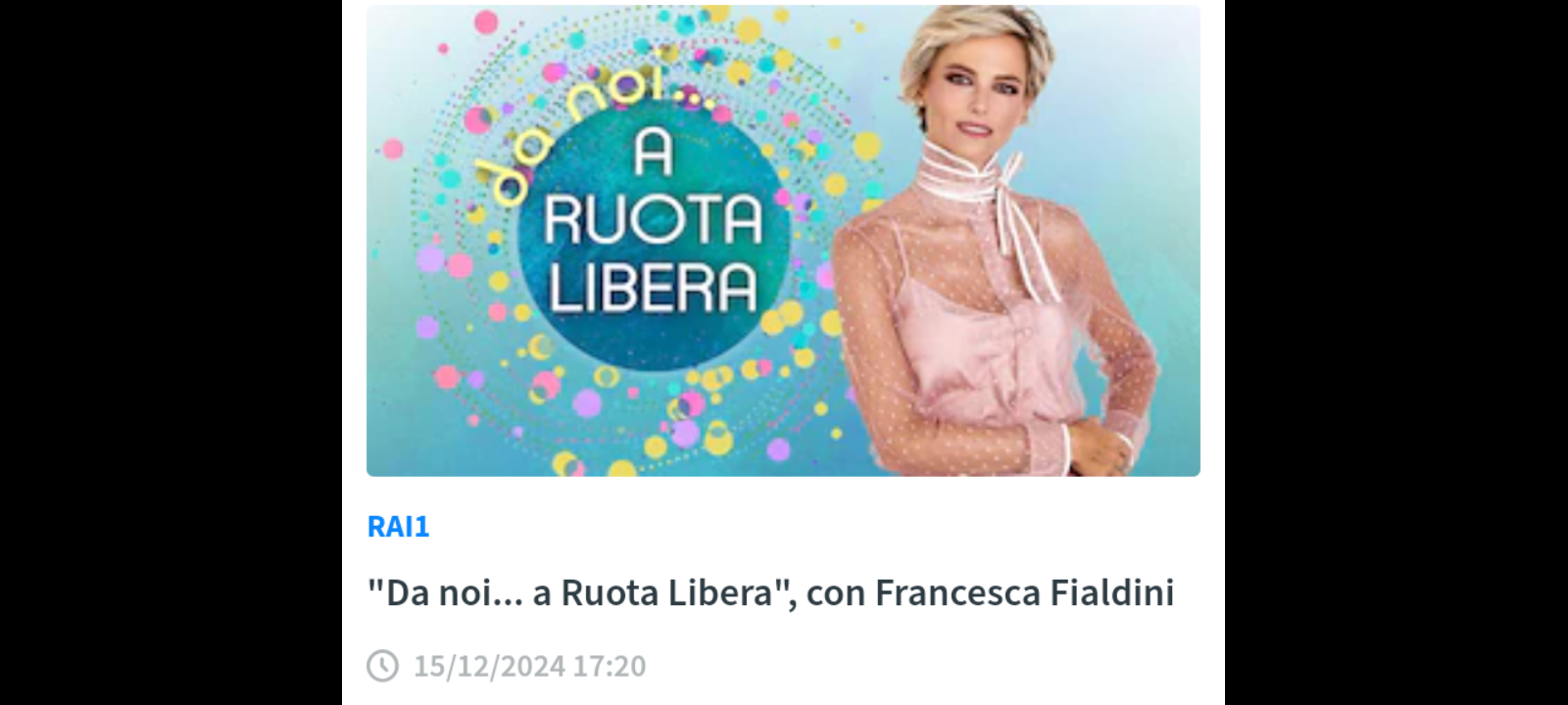 ‘Selvaggia Lucarelli, Massimiliano Ossini, Massimiliano Gallo e Arianna Talamona’: sono loro gli ospiti della puntata di “Da noi… a Ruota Libera”, il programma realizzato dalla direzione Intrattenimento Day Time in collaborazione con Endemol Shine Italy, condotto da Francesca Fialdini e in onda domenica 15 dicembre alle 17.20 su Rai1.