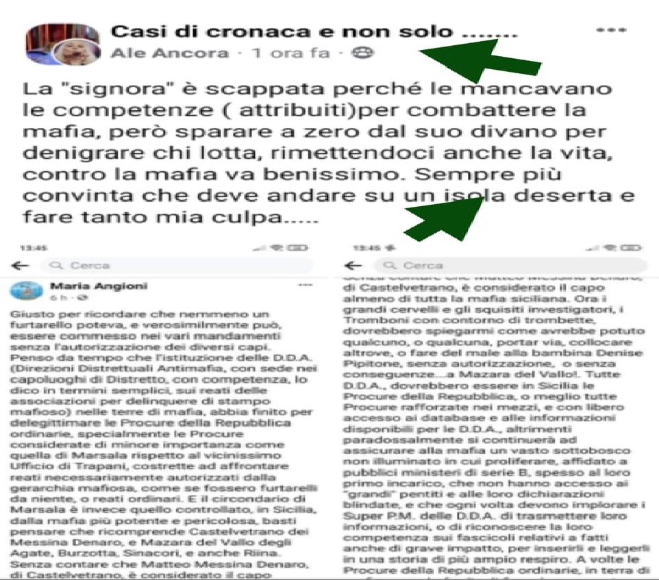 Denunciamo, che, da mesi la Angioni è l’obiettivo di una macchina del fango che su di lei viene buttato da parte di un gruppo di persone sostenitrici accanite di Piera Maggio, la mamma della bambina. Gli accennati soggetti, contro chiunque osa pensarla diversamente da loro, su come siano potuti andare i fatti a partire da quel maledettissimo giorno di 18 anni fa, si scagliano bullizzando e stalkerizzando i poveri malcapitati fra i quali colei che è maggiormente vessata è proprio la Angioni colpevole a detta di questi personaggi di non avere fatto nulla di concreto per ritrovare la bimba.