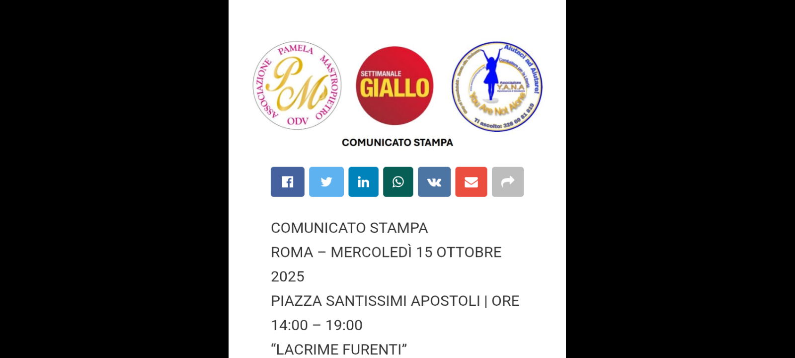 L’evento è promosso da Associazione Y.A.N.A. – You Are Not Alone ODV e Associazione Pamela Mastropietro ODV, con la collaborazione del settimanale GIALLO e di altre numerose realtà associative italiane, tra cui Unione Nazionale Vittime, Associazione per Te, Associazione Salvamamme e molte altre: una manifestazione che non aspetta il 25 novembre “Lacrime Furenti” non si ferma a una data simbolica… nasce in un giorno qualunque, per ricordare che la lotta alla violenza non può limitarsi a ricorrenze o slogan.
