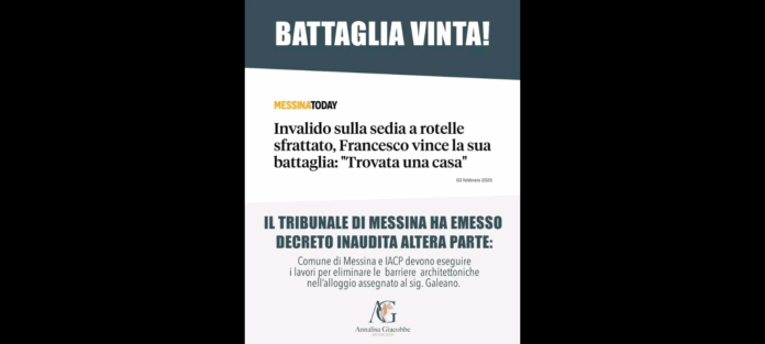 “Sono veramente molto felice che il Tribunale di Messina abbia accolto il ricorso che abbiamo presentato pochi giorni fa in nome e per conto del nostro assistito, il sig. Galeano, invalido al 100%, su sedia a rotelle e affetto da gravi condizioni di salute (amputazione bilaterale degli arti inferiori), che negli scorsi mesi era stato assegnatario di un alloggio ERP, con bagni inaccessibili per una persona in sedia a rotelle”. A scriverlo nei giorni scorsi, sulla sua omonima Pagina Facebook, è stata l’avvocato messinese Annalisa Giacobbe.