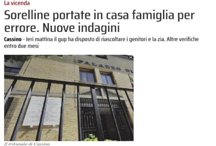 Sorelline portate in casa famiglia per errore, dopo l’udienza del 27 aprile 2023 di opposizione all’archiviazione, il gup Lo Mastro ha chiesto di integrare le indagini: verranno riascoltati i genitori e la zia alla quale sono state affidate le minorenni… insieme ad altri accertamenti che dovranno essere conclusi entro 60 giorni. La storia delle due sorelline strappate all’affetto della zia alla quale erano state affidate sembra non conoscere fine… nella mattina di giovedì scorso, infatti, con l’udienza di opposizione all’archiviazione a carico di tre assistenti sociali (accusati di abuso di ufficio) sono state disposte ulteriori verifiche sull’accaduto.