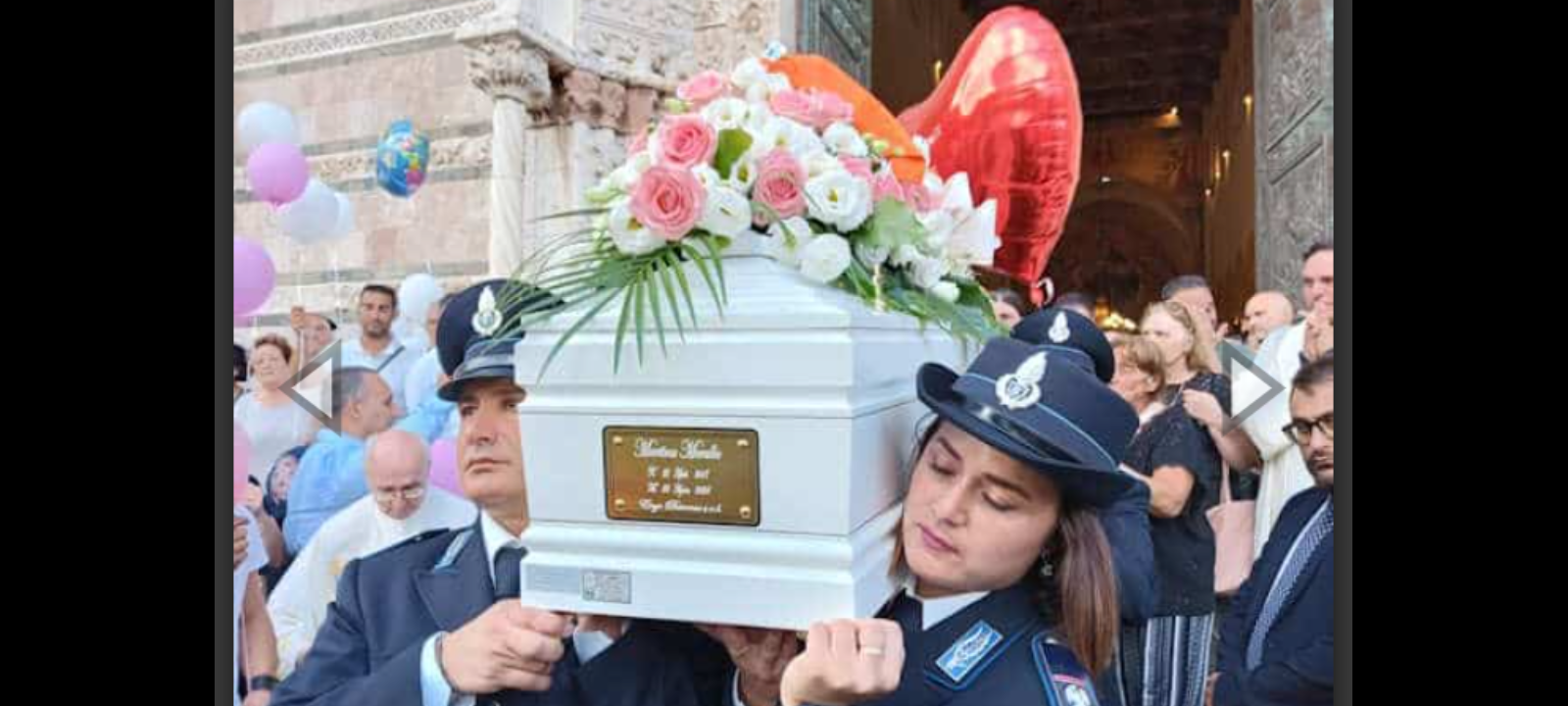 La cerimonia funebre, officiata oggi pomeriggio dopo le 16.30 da don Bartolo Calderone, ha riunito una folla numerosa e silenziosa presso il Duomo. All’esterno dell’edificio di culto…, una gigantografia della piccola Martina (7 anni) ha accolto i presenti, mentre sulla bara, accanto alla sua foto, erano posizionati un poster con messaggi e immagini lasciati dagli amici, un abitino della scuola di danza e due palloncini colorati raffiguranti il personaggio di Stitch. Questi dettagli hanno richiamato la vitalità e la gioia di vivere di Martina, alla quale tutti hanno voluto dire “arrivederci” piuttosto che “addio”, testimoniando un legame d’affetto che va oltre la tragica perdita. Tra i presenti anche un picchetto d’onore delle guardie della Casa circondariale di Gazzi, dove lavora il padre di Martina.