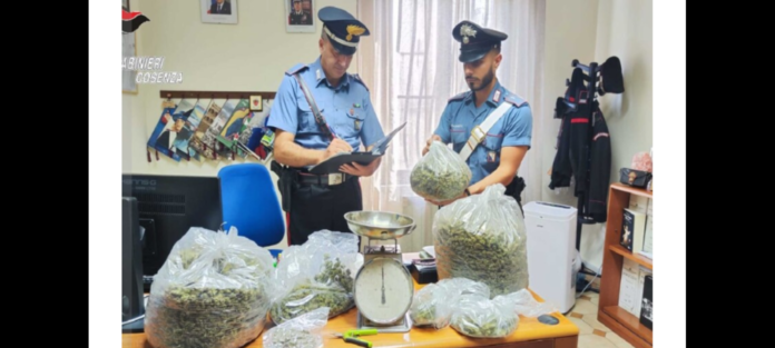 Il soggetto…, in un locale esterno e adiacente alla sua abitazione, avrebbe nascosto 5,8 chilogrammi di marijuana. I militari, nel corso di una perquisizione domiciliare nell’abitazione del cinquantaduenne sottoposto alla misura dei domiciliari per analogo reato, hanno trovato un recipiente con all’interno la droga. L’uomo è stato condotto nel carcere di Cosenza.
